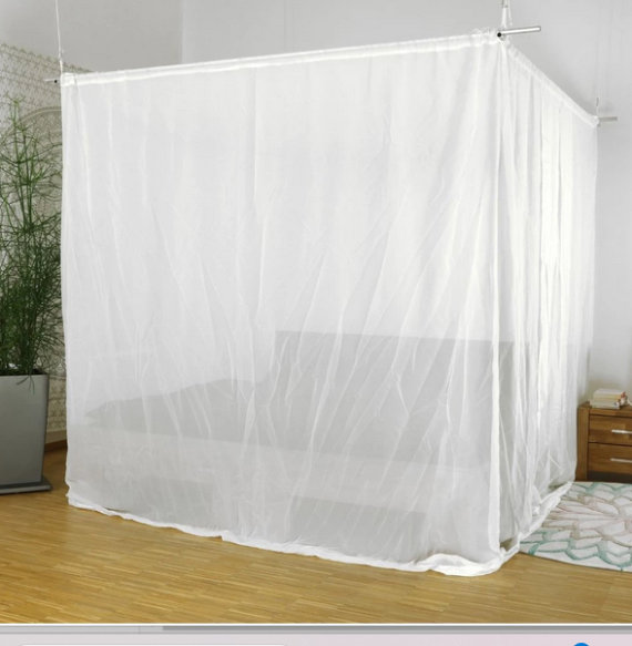 Montage: Aufhängung über vier Punkte an der Decke. Zur Stabilisierung der Kastenform können in die oben eingenähten Laschen beliebige Stangen (nicht im Lieferumfang) eingeschoben werden